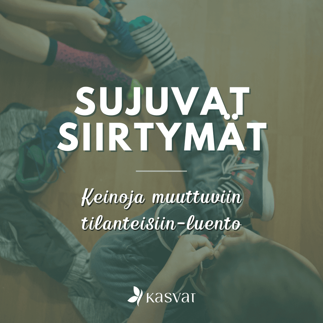 Sujuvat siirtymät – keinoja siirtymätilanteisiin -luento on käytännönläheinen luento vanhemmille, joille on tuttua ne hetket kun pitäisi siirtyä tilanteesta toiseen tai paikasta toiseen ja lapsi on eri mieltä. Pukeminen ei kiinnosta, leikkien lopettaminen ei myöskään, siirtymä mihin tahansa aiheuttaa aina jonkinlaista vääntöä.